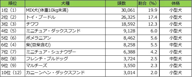 「ミニチュア・ダックスフンド」は前年5位から4位へ、「ポメラニアン」は6位から5位へと順位を上げ、上位層での僅差の順位変動が見られました。また、「カニーンヘン・ダックスフンド」は前年12位から10位へ順位を上げ、トップ10にランクインしました。