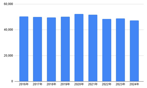 5万頭前後で安定して推移しており、全体2位の犬種です