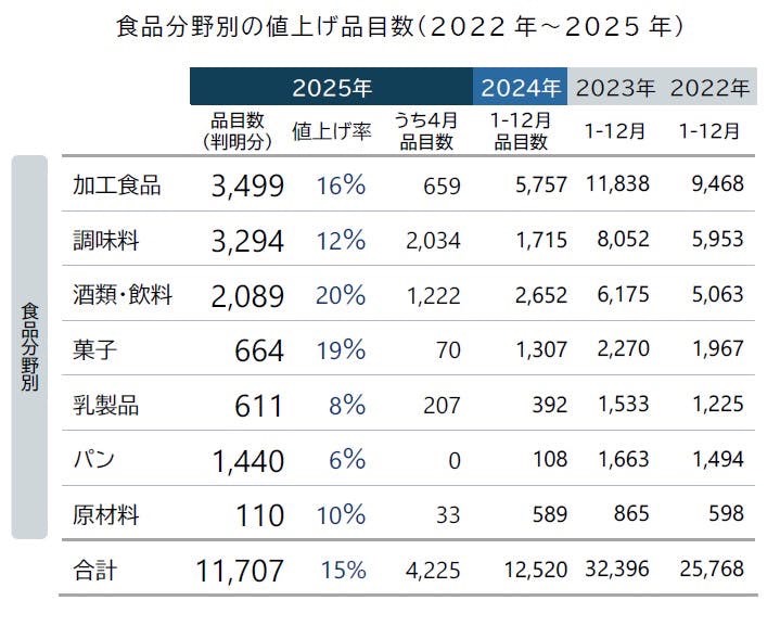 2025年の値上げ動向は全体的に値上げの動きが低位に抑えられた前年に比べ、少なくとも今夏にかけて断続的な値上げラッシュの発生が見込まれるとしている。