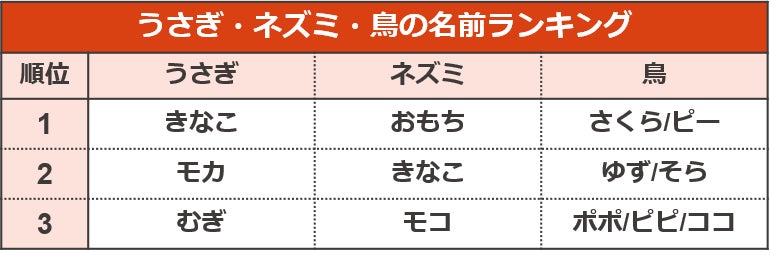うさぎの「きなこ」は5年連続、ネズミの「おもち」は3年連続、鳥の「ピー」は昨年に引き続き2度目の1位を獲得しました。うさぎのランキングで2位となった「モカ」や、ネズミのランキングで2位の「きなこ」、3位の「モコ」は、犬・猫共通で人気の高い名前で、発音のしやすさや音の可愛さもあり、小動物の名前としても人気が出てきているようです。