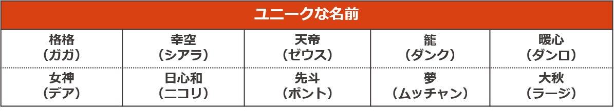 また、昨年圏外だった「モカ」が6位にランクインしたほか、10位には初登場となる「うに」がランクインしました。一方で昨年5位の「マロン」が初めてランク外となり、2文字の名前が90%を占めました。