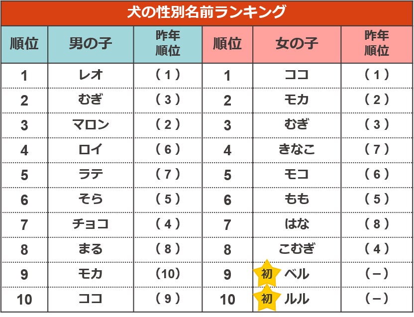 犬の性別ランキングでは、男の子の「レオ」と女の子の「ココ」が共に8連覇となり、長きにわたり人気を保っています。男の子のランキングでは、順位の変動はあるものの、トップ10の顔ぶれに変化はありませんでした。一方、女の子のランキングでは、9位の「ベル」と10位の「ルル」が初めてランクインしました。男の子も女の子も、短く呼びやすい名前が人気で、身近な飲食物を連想する、親しみやすい名前が約半数を占めています。