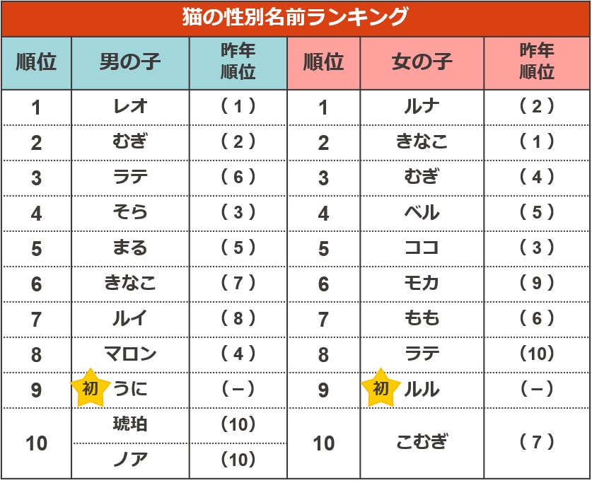 また、男の子のランキングでは「レオン」がランク外となり、代わって「うに」が初のランクインとなりました。女の子のランキングでは、昨年初のランクインとなった「メル」がランク外となり、新たに「ルル」がランクインしました。