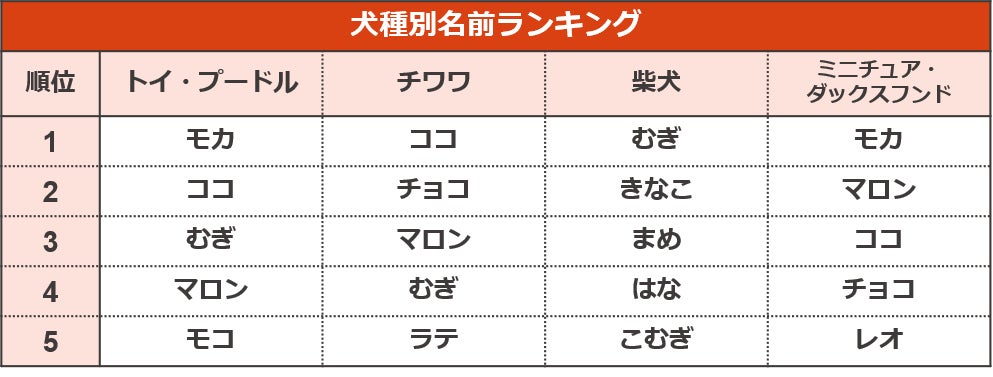 犬種別のランキングでは、トイ・プードルのランキングで「むぎ」が初のランクインとなりました。「むぎ」は総合ランキングでも人気の高い名前ですが、洋風なイメージのトイ・プードルの名前としても人気が高まっているようです。チワワのランキングでは、6年ぶりに「ココ」が1位となりました。柴犬のランキングでは、昨年ランク外となった「まめ」「はな」が返り咲き、人気上位には和風の名前が並びました。ミニチュア・ダックスフンドでも、昨年ランク外となった「ココ」が3位に浮上しており、チワワ同様「ココ」の人気が高まっています。「ココ」は犬種の別を問わず人気の名前となってきているようです。