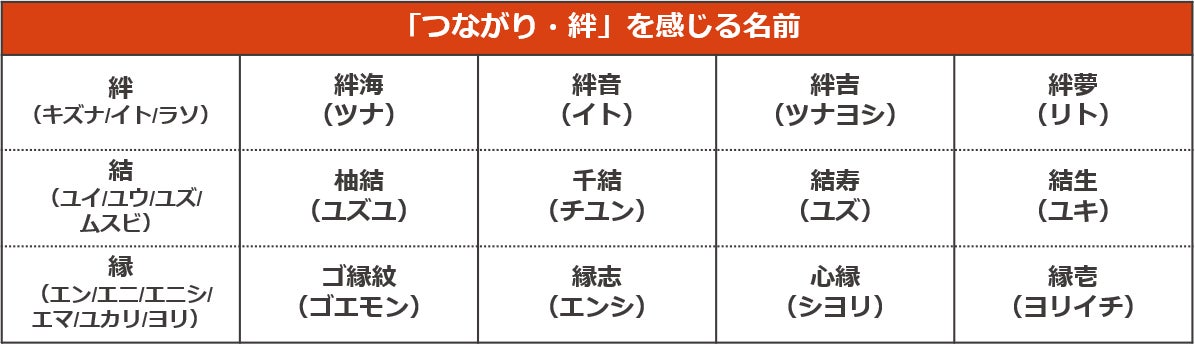 「絆」はキズナやイト、「結」はユイやムスビ、「縁」はエマやユカリといったように、漢字1字に対して様々な呼び方の名前がありました。「縁壱」のように、人気漫画の登場人物の名前もありました。