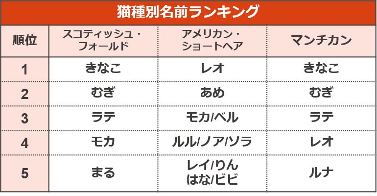 猫種別ランキングでは、昨年のランキングで半数以上がひらがなの柔らかい印象の名前であったのが一転し、ランクインした21の名前のうち60%以上となる13の名前が、カタカナの名前で占めました。初めてランクインしたのは、スコティッシュ・フォールドの4位「モカ」、アメリカン・ショートヘアの2位「あめ」、3位の「モカ」「ベル」、4位の「ルル」「ソラ」など多岐にわたっており、特にアメリカン・ショートヘアでは1位の「レオ」を除き、ほとんどが初のランクインとなる激しい変動をみせました。