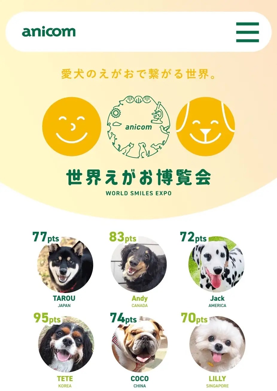 ペット保険シェアNo.1(※)のアニコム損害保険株式会社(代表取締役 野田 真吾、以下 アニコム)は、犬の写真を登録いただくとAIが笑顔度を判定するサイト『世界えがお博覧会』を、4月23日に公開いたしました。飼い主さまにとって大切なわが子である愛犬の笑顔度を判定することで、人間の言葉を話さないどうぶつたちの声に耳を傾けるとともに、私たち人間を幸せにしてくれる犬の笑顔を、世界中へ届けてまいります。