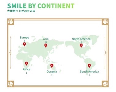 公開された笑顔は、お名前で検索できるほか、世界の大陸(アジア、オセアニア、ヨーロッパ、アフリカ、北アメリカ、南アメリカ)ごとに閲覧も可能となっています。