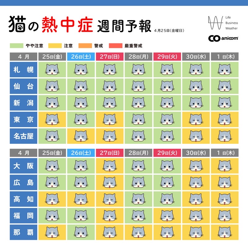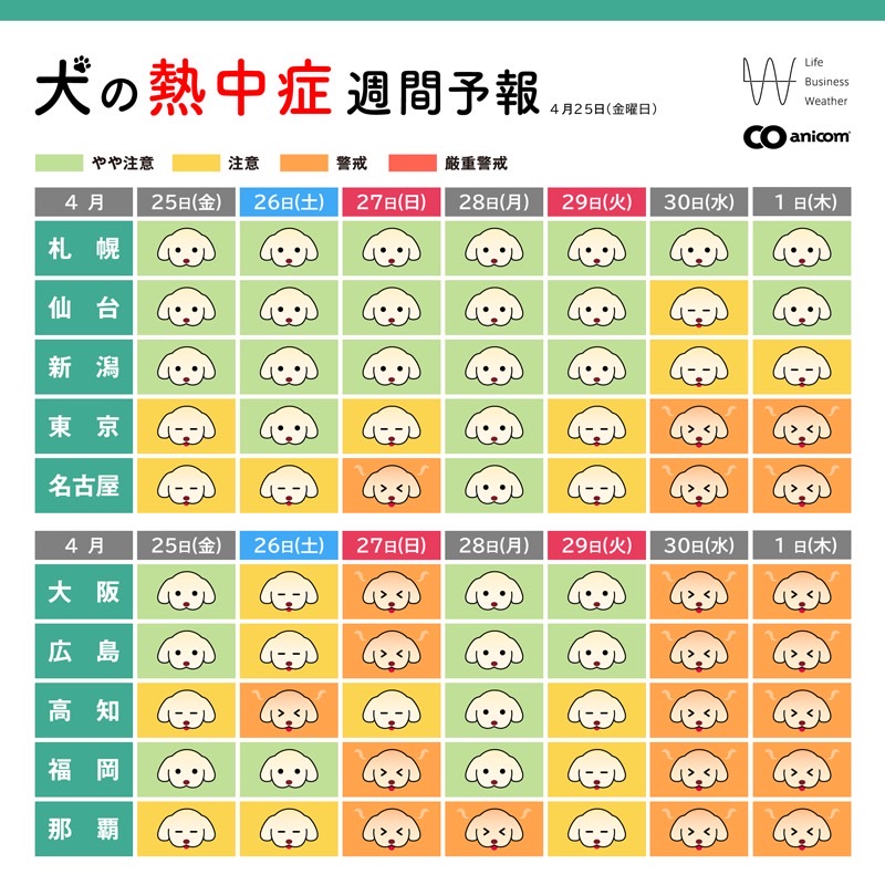 犬と猫の「熱中症週間予報」は、株式会社ライフビジネスウェザーとアニコム損保が独自に開発した熱中症指標をもとに作成しています。犬と猫それぞれの体高や代謝などを考慮した指標と1週間分の気象予報から、全国主要10都市の熱中症注意レベルを「やや注意」「注意」「警戒」「厳重警戒」の4段階に分け、それぞれ犬と猫のイラストで表示します。