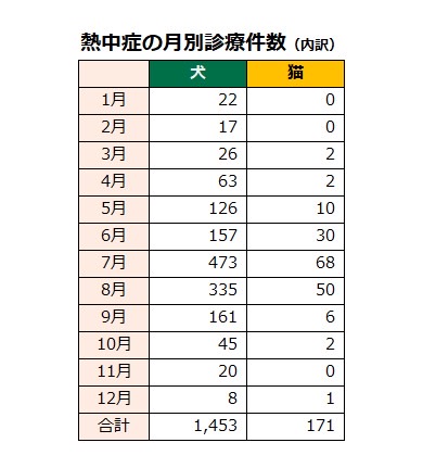 2024年の熱中症の診療件数について調査したところ、犬は1,453件、猫は171件でした。