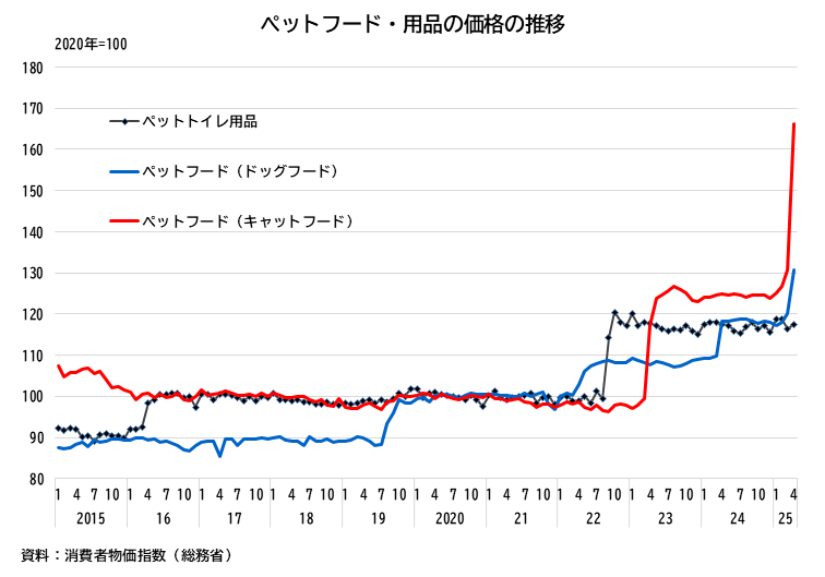 ペットを取り巻く環境は2020年から変化が見られ、2025年は特にペットフードの価格上昇が顕著です。