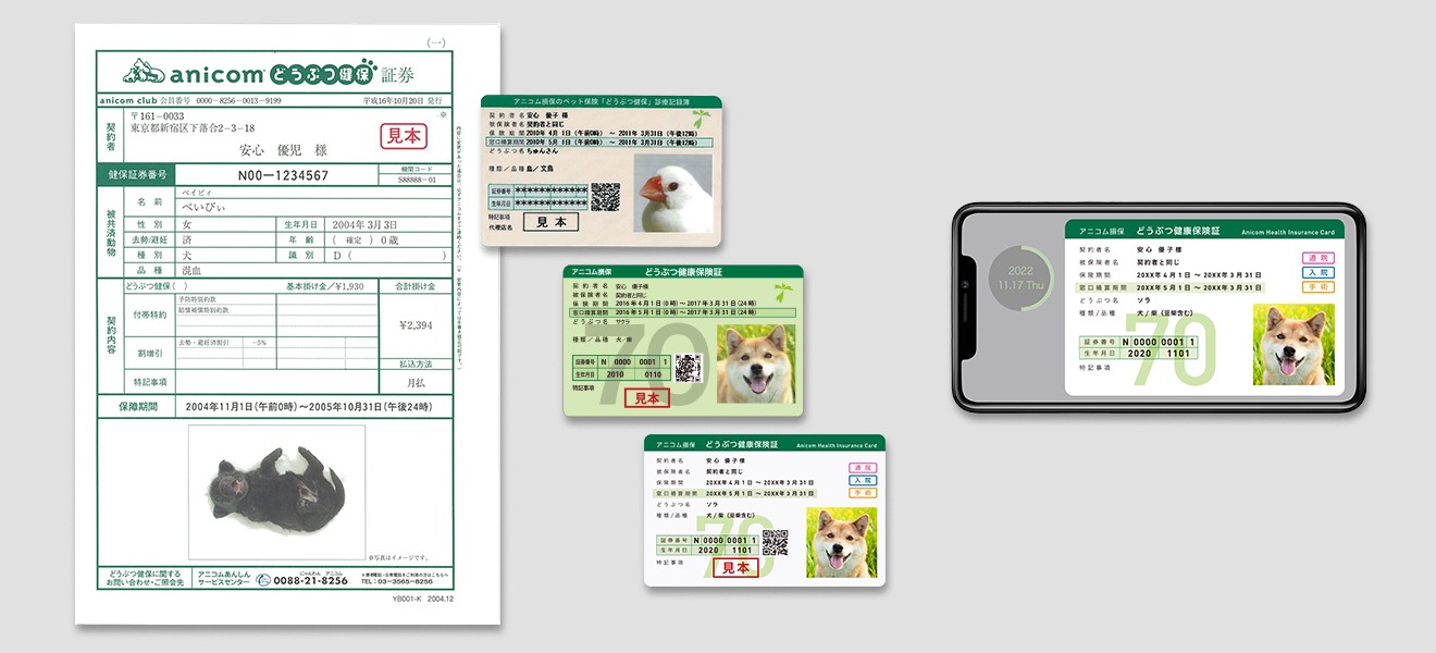 アニコムでは、2000年の創業当初から、動物病院の窓口で使える「ペットの保険証」をご用意しています。人と同じくペットにも日々の健康を支える仕組みが必要であり、人と同じような保険証を“家族の一員の証”としてもらいたい。そんな思いが詰まったアニコムの象徴ともいえる保険証は、時代にあわせて紙からカードタイプに、そしてデザインもリニューアルを重ねてまいりました。