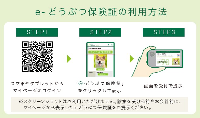 A. スクリーンショットではお使いいただけません。マイページから表示した『e-どうぶつ保険証』ご利用ください。