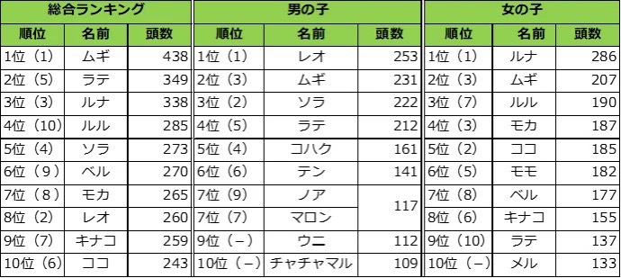 2位は「ラテ」(349頭)、3位は「ルナ」(338頭)と続き、上位3位はいずれも300頭を超える結果となりました。また「ルル」は前年10位から4位(285頭)へと大きく順位を上げ、「ラテ」も5位から2位へ上昇するなど、上位で順位の変動が見られました。