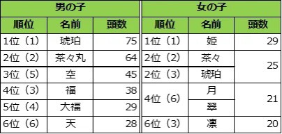 男の子部門では「琥珀」(75頭)が1位となり、昨年に続きトップを維持しました。2位は「茶々丸」(64頭)、3位は「空」(45頭)でした。女の子部門では「姫」(29頭)が1位。「琥珀」(25頭)は女の子部門でも3位に入り、男女双方で上位にランクインしました。漢字表記では、男女ともに自然や縁起を連想させる名前が多く見られました。