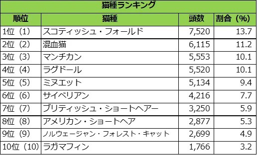 猫種ランキングでは、「スコティッシュ・フォールド」(7,520頭、13.7%)が1位となりました。2位は「混血猫」(6,115頭、11.2%)、3位は「マンチカン」(5,553頭、10.1%)と続きました。上位3猫種で全体の約35%を占めています。上位10猫種はいずれも前年と同順位で、構成は安定していることがうかがえます。